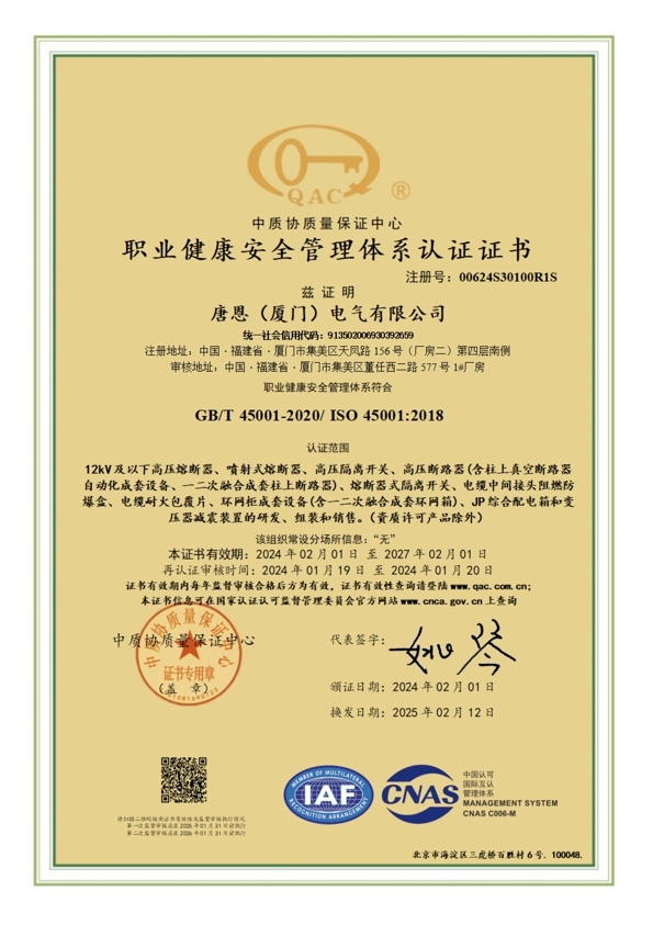 职业健康安全管理体系认证证书