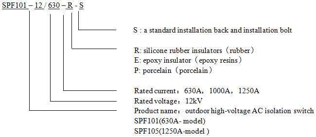 For example: SPF101-12 / 1250-R-S, represents outdoor 12kV isolation switch, rated current of 1250A, with the use of silicone insulators, including standard installation back and bolt.
